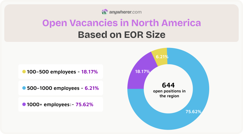 North America shows a strong hiring activity, especially among large EOR enterprises, which account for 75.6% of NA’s total vacancies. This suggests that the region remains a central hub for EOR operations and that large-scale firms are aggressively expanding. Meanwhile, as the stats demonstrate, smaller businesses still contribute meaningfully to the growth of NA-based vacancies.